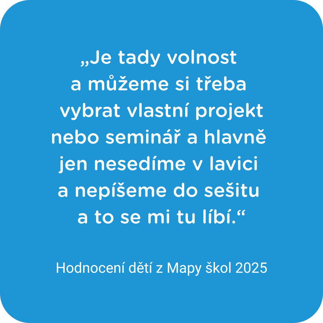 Děti a studenty vedeme k odpovědnosti za své vzdělávání, za sebe i za svět kolem. Dáváme jim svobodu rozhodovat se o své cestě.